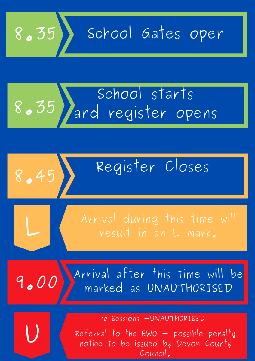 School drop-off starts from 8:35am and children will need to be in school by 8:35am to start their lessons. Parents must drop off their child at the gates where a member of staff will be present. Any child arriving between 8.45 and 9.00 will be marked as late and any child arriving after 9.00 will be marked down as an unauthorised absence.